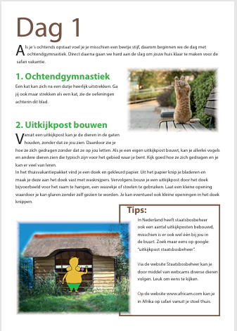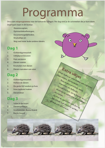 Wat zit er allemaal in? Drie volle dagen met activiteiten, knutseltips, dierenrecepten, bewegingsoefeningen én spelletjes – alles kant-en-klaar uitgewerkt, zodat jij als ouder nergens naar hoeft te zoeken. Zie enkele voorbeeldpagina’s hieronder.